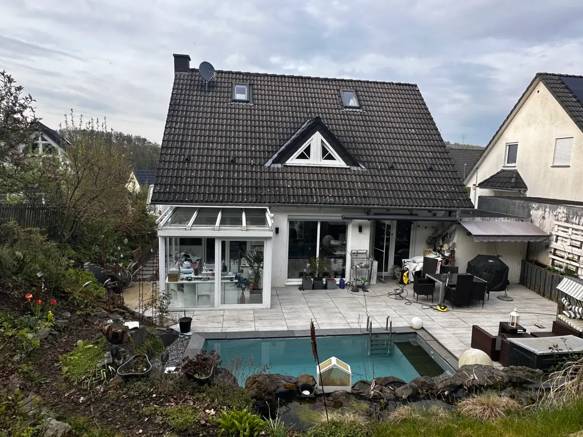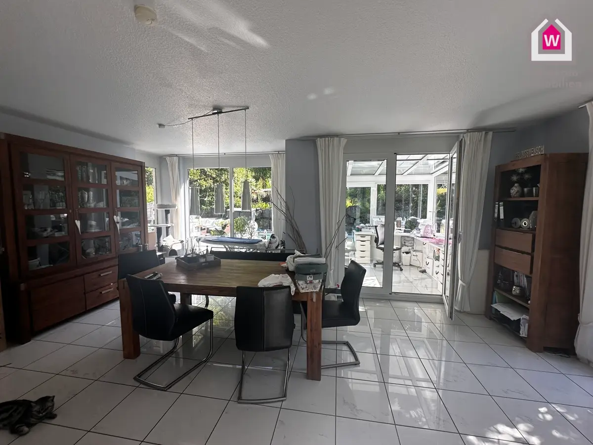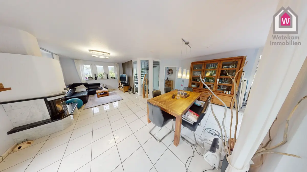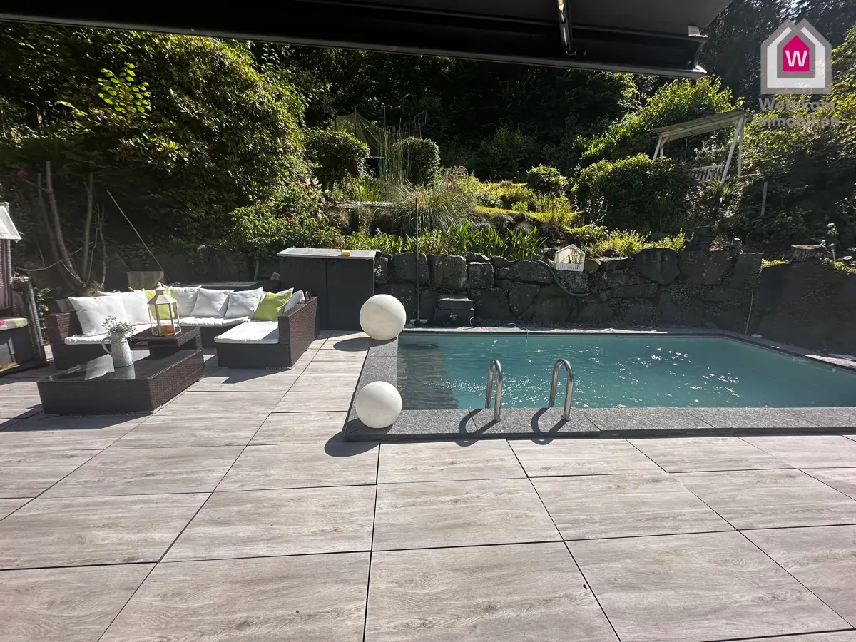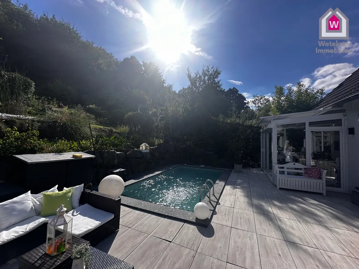 Das Herzstück des Erdgeschosses bildet der großzügige Wohn- und Essbereich. Hier sorgt ein gemütlicher Kamin für behagliche Abende, während der angrenzende Wintergarten das ganze Jahr über eine Verbindung zur Natur bietet. Von hier aus gelangen Sie auf die erste von drei weitläufigen Terrassenebenen. Diese Terrasse beeindruckt mit einem fantastischen Salzwasserpool, der erst im letzten Jahr erbaut wurde und mit einer Gegenstromanlage ausgestattet ist – perfekt für Ihre sportlichen Aktivitäten im Freien. Ein stilvoller Loungebereich lädt zum Entspannen und Genießen ein.