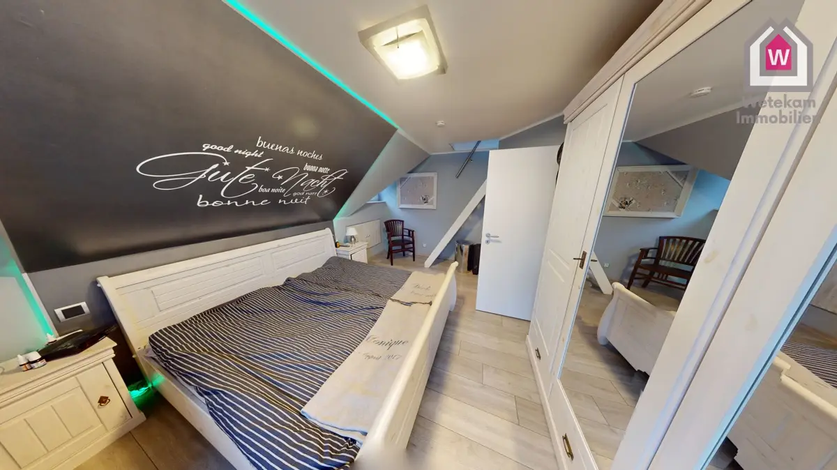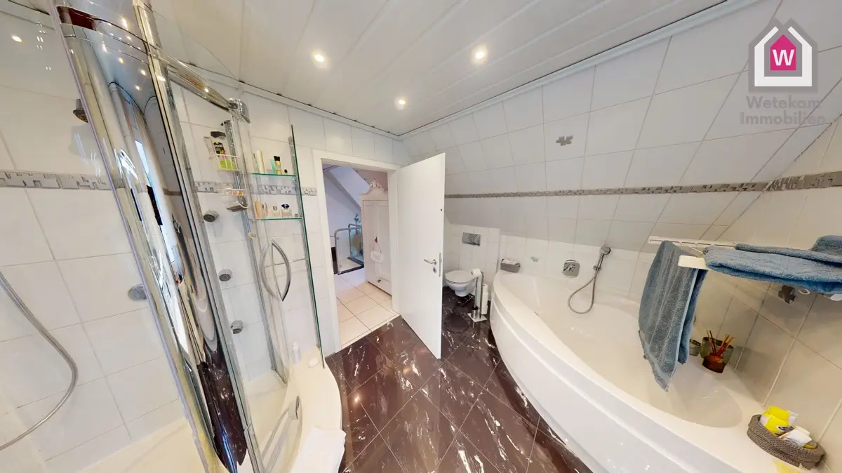 Im Obergeschoss erwartet Sie das luxuriöse Hauptbadezimmer, ausgestattet mit einer eleganten Eckbadewanne und einer Wellnessdusche. Drei geschmackvoll eingerichtete Schlafzimmer bieten Raum für Ihre Familie und Gäste. Zwei dieser Zimmer haben direkten Zugang zum ausgebauten Dachgeschoss, das vielseitige Nutzungsmöglichkeiten bietet, von einem begehbaren Kleiderschrank bis hin zu einem exklusiven Büro.
