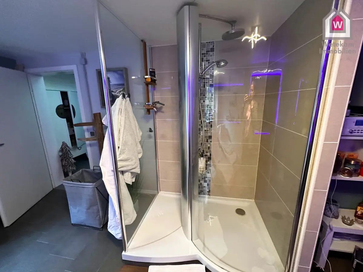 Hier entdecken Sie eine wahre Wellnessoase mit einer hochwertigen Sauna, einem einladenden Ruhebereich und einer großzügigen Regenschauerdusche.