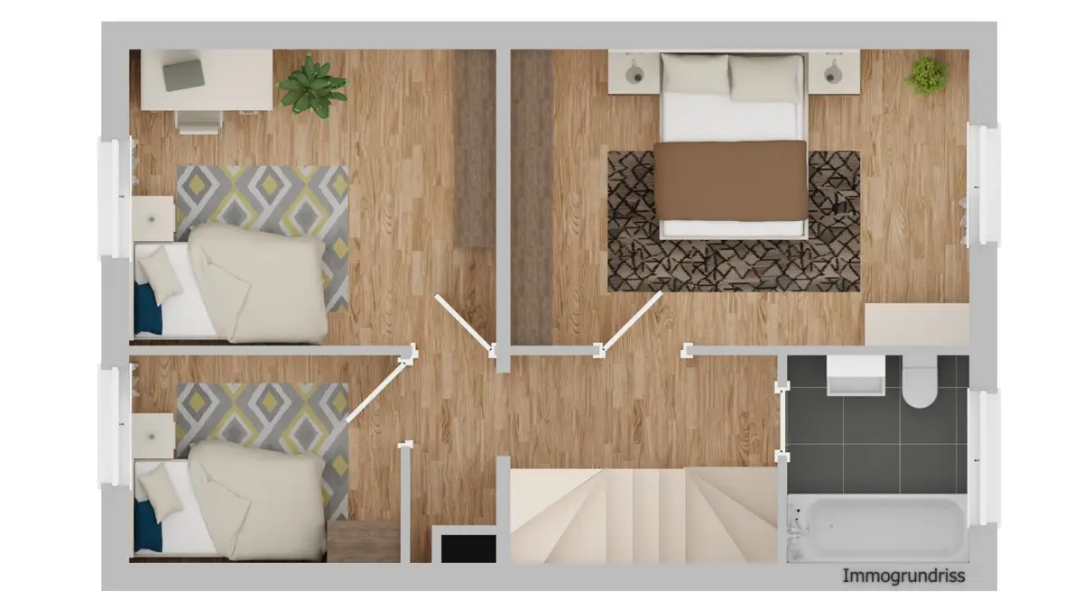 Im Obergeschoss finden Sie drei gut geschnittene Schlafzimmer, die Ihnen