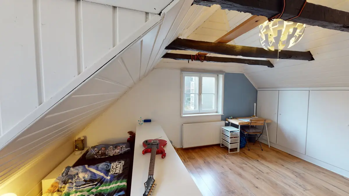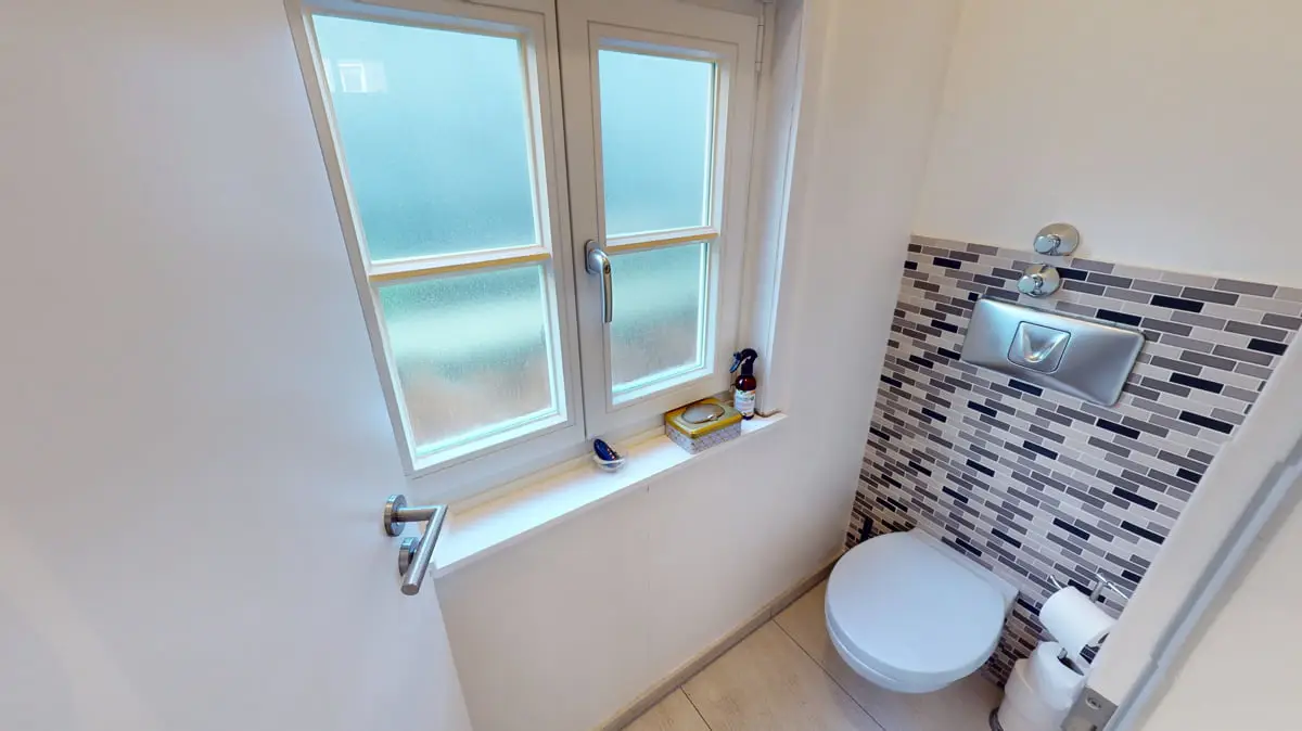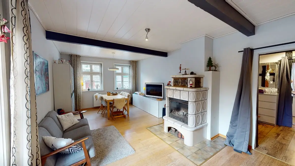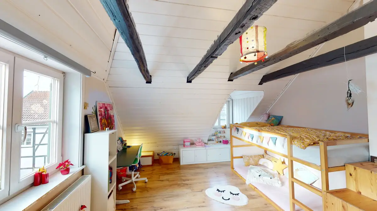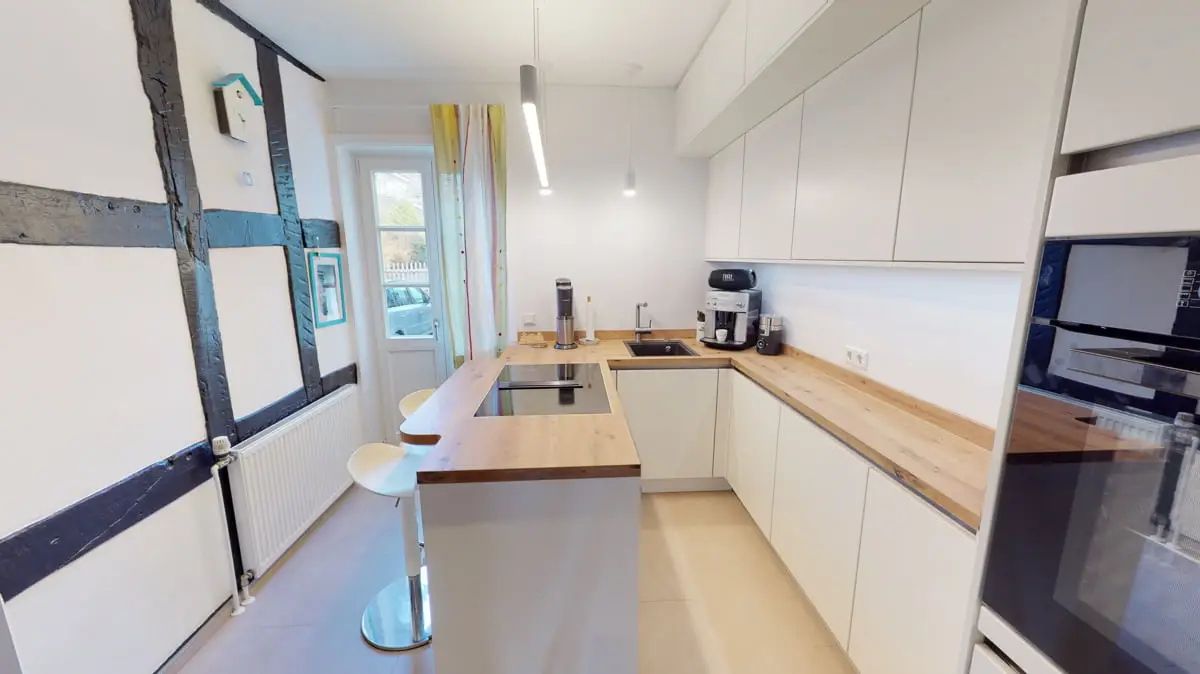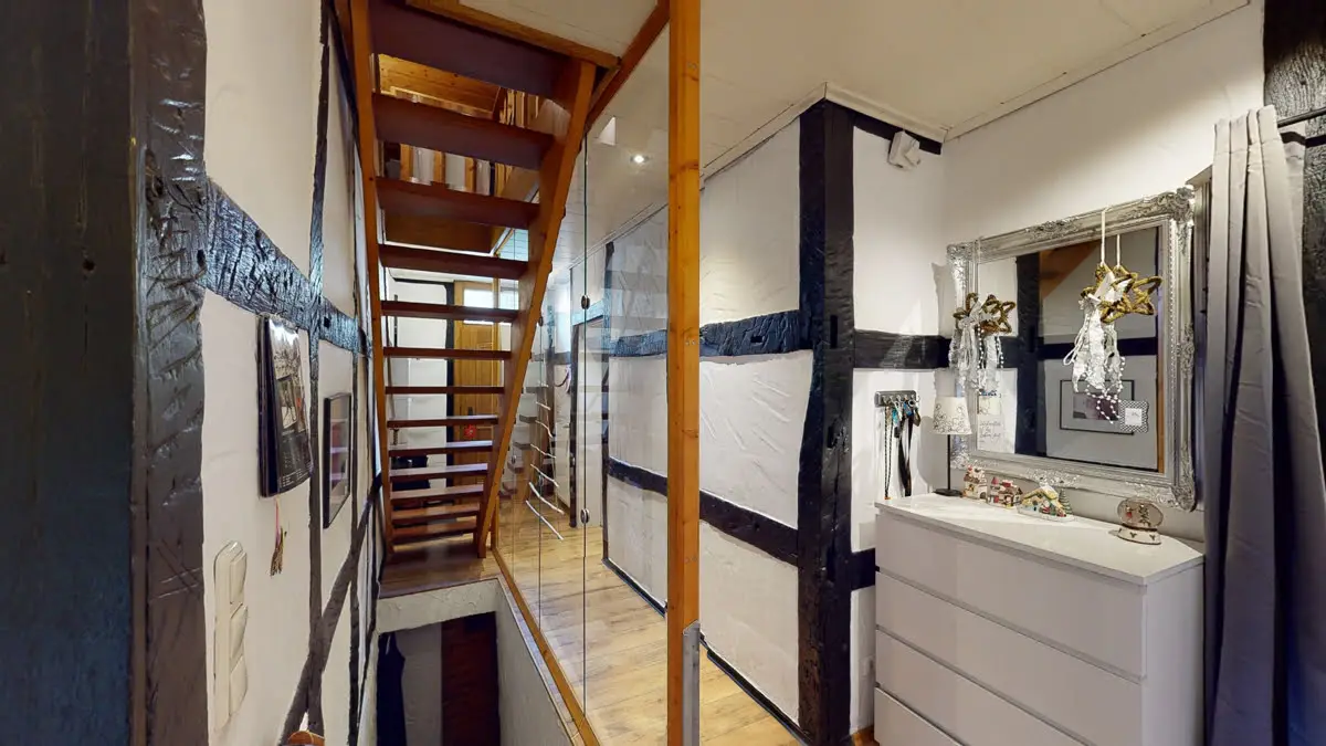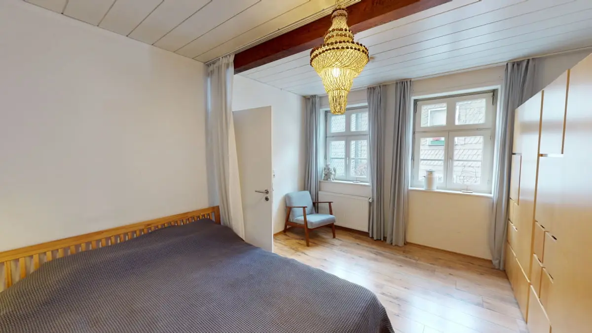 Über eine kleine Natursteintreppe gelangen Sie zur Haustür Ihres neuen Eigenheims. Der Flur führt Sie geradeaus rechts in den Wohnbereich, vorne finden Sie zur linken Hand das geräumige Schlafzimmer. Ein absoluter Blickfang im Korridor ist die schicke Holzbalken/Glas-Kombination, welche den historischen Charme dieser einzigartigen Immobilie noch weiter hervorhebt. Im hinteren Bereich des Hauses befinden sich die Küche und das Wohnzimmer, in welchem sich die Familie um den gemütlichen Kachelofen versammelt. Der in freundlichen, hellen Farben gestaltete Küchenraum besticht durch seine modernen Einbaugeräte sowie die funktionelle Aufteilung. Abschließend finden Sie auf dieser Etage auch noch das Gäste WC. Das Obergeschoss teilt sich auf in zwei große Räume, die optimal als Kinder-, Arbeitszimmer oder Hobbyraum genutzt werden können. Außerdem befindet sich auf dieser Etage noch ein Duschbadezimmer. Im Kellergeschoss befindet sich ein weiteres Badezimmer sowie ein großer Raum mit eigenem Ausgang zur Hofseite, welcher aktuell als Partykeller genutzt wird.