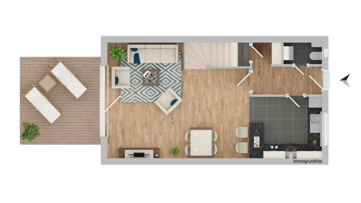 Im Erdgeschoss erwartet Sie ein lichtdurchfluteter Wohnbereich, welcher mit ca. 30m² ebenfalls genug Platz für einen Esstisch bietet, um sich gemeinsam mit der Familie zusammenzusetzen, der Wohnbereich bietet nahtlosen Zugang zur Terrasse und dem liebevoll gestalteten Garten mit eigenem Gartenhäuschen. Im Garten können Sie entspannte Stunden im Freien verbringen oder gesellige Grillabende mit Freunden und Familie genießen. Die moderne Küche ist hell und offen und bietet ausreichend Platz für kulinarische Entfaltung. Ein praktisches Gäste-WC rundet das Erdgeschoss ab.